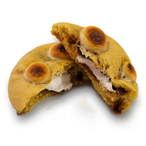 Galleta con masmelo rellena de chocomelo: Suaves trozos de masmelo se funden en la masa doradita, mientras en el corazón espera un relleno cremoso de chocomelo. Cada mordida es un viaje entre lo esponjoso, lo pegajoso y lo achocolatado… como tener tu propio s’more colombiano en versión galleta.